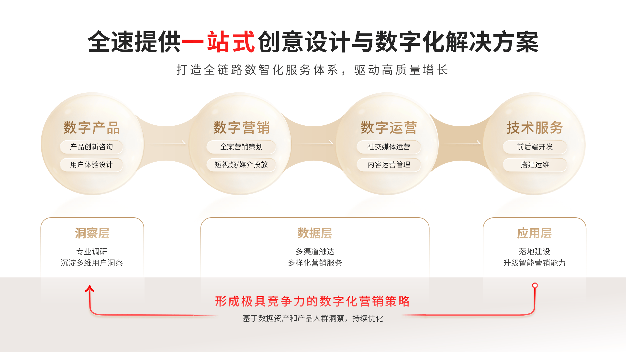 全速网络以设计创造价值为宗旨,为企业提供一站式创意设计与数字化解决方案,覆盖用户体验设计、数字营销、创意设计、内容运营、技术服务五大核心业务板块。