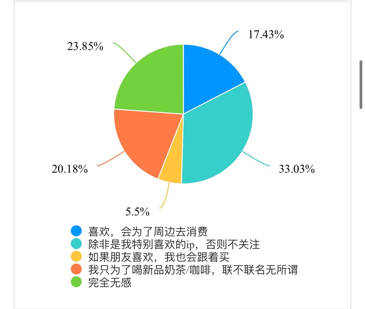 面对品牌密集的上新动作,39.45%的消费者表现得冷淡,表示“不会被吸引,只点固定爱喝的那几类”;对于火热的IP联名,23.85%的受访者“完全无感”,20.18%的消费者表示,只是为了买那一杯新饮品,“联不联名无所谓”。仅有17.43%的受访者明确表示“会为了周边去消费”。