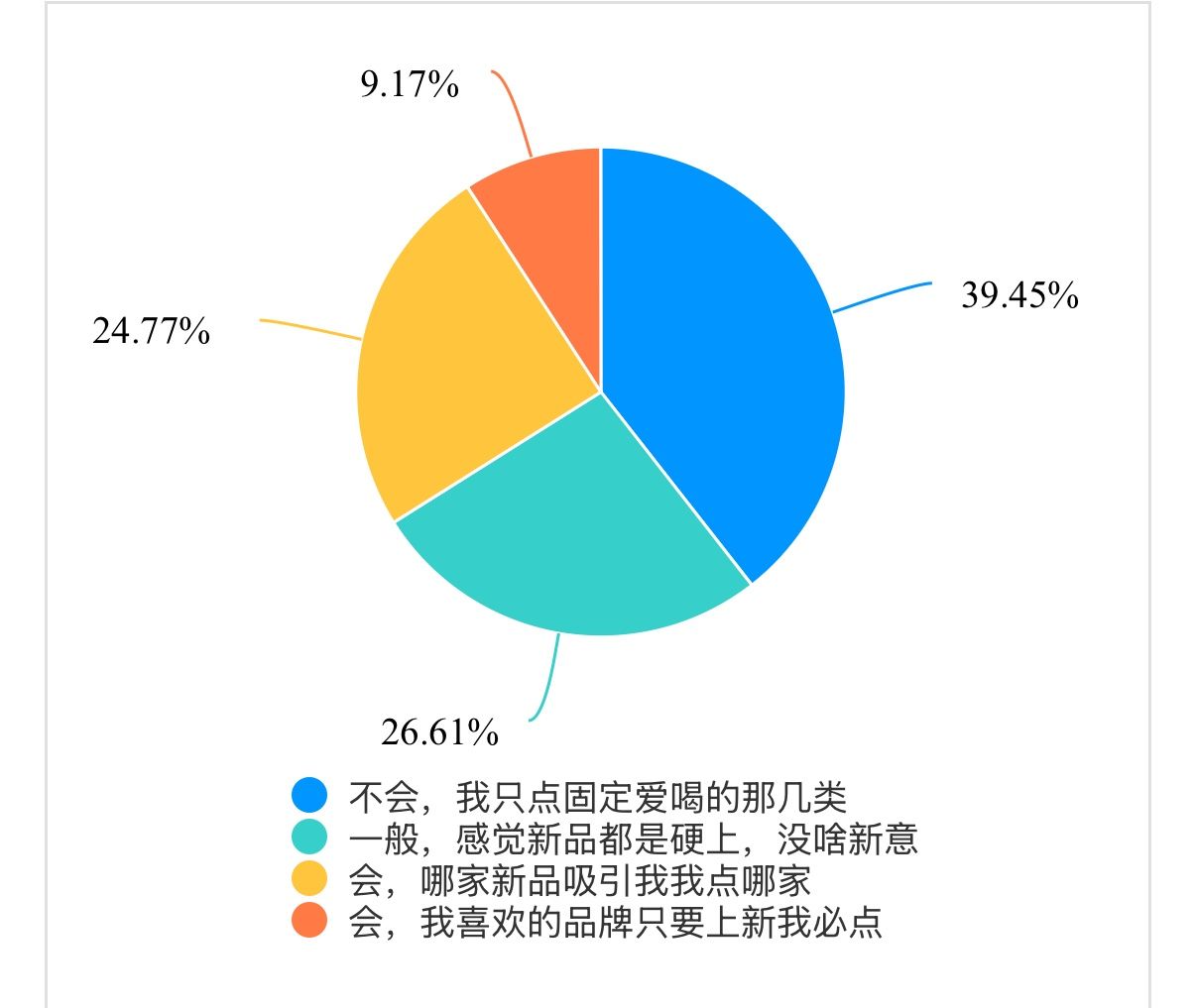与此同时,频繁的上新可能对提高复购没有那么有效。39.45%的受访者表示,自己只点固定爱喝的产品。只有三成左右的受访者表示,会被新品吸引。9.17%的受访者表示,自己忠于品牌,“喜欢的品牌上新,我必点”。