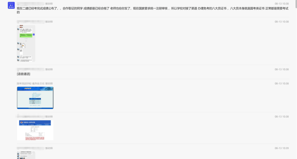 面对质疑,机构工作人员郭老师辩称:“因为其他机构知道咱们有内定取证方式,他们办不了,就诋毁我们”;当王女士进一步追问所谓“密卷”真实性时,对方又回应“不是真的 这么多同学考过拿证”。为了证明自己,工作人员郭老师还发来其他学员的聊天记录和成绩查询的截图,这些无有效佐证的材料,没能打消王女士的疑虑。