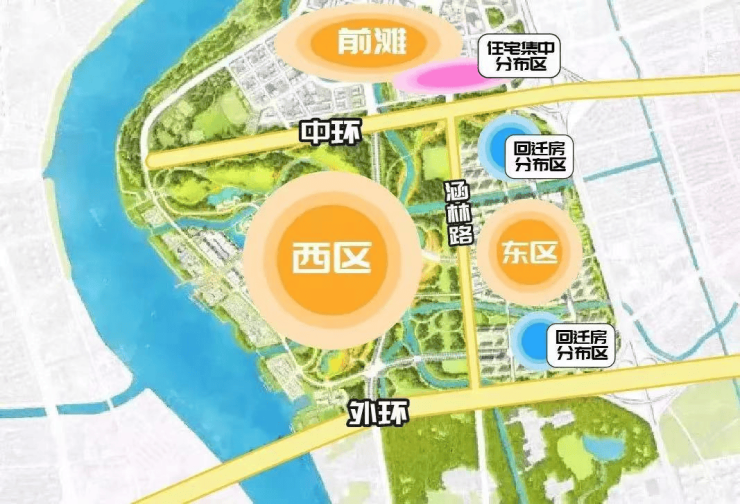 而前滩南滨江是紧贴着前滩的南面,二者的分界线就是中环路的道路中心线”距离。