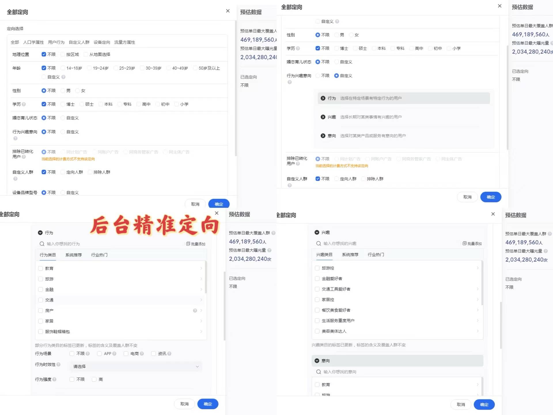接下来,你需要设置账户定向包,确定广告投放给什么人群、在什么时间段开始投放以及投放哪些地域。你可以在后台设置年龄、性别、爱好、学历、恋爱状态、地域等更多选项,确保广告精准触达目标用户。