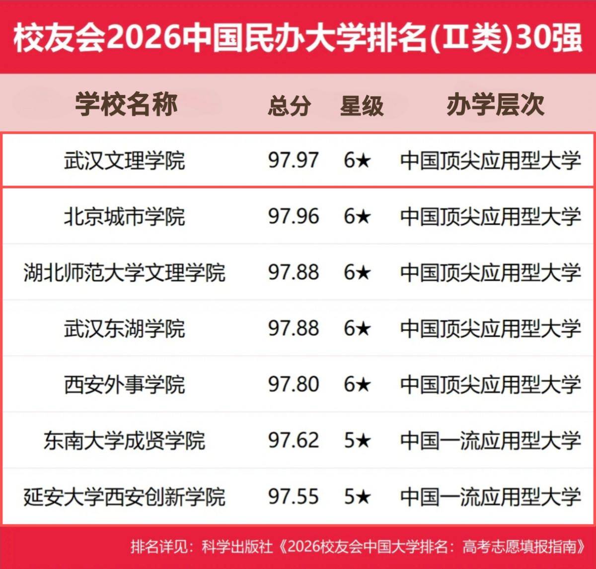 1月12日,《2026校友会中国大学排名:高考志愿填报指南》正式发布,在校友会2026中国民办大学排名(Ⅱ类)30强榜单,武汉文理学院排名前列,其办学层次被认定为6星级“中国顶尖应用型大学”。