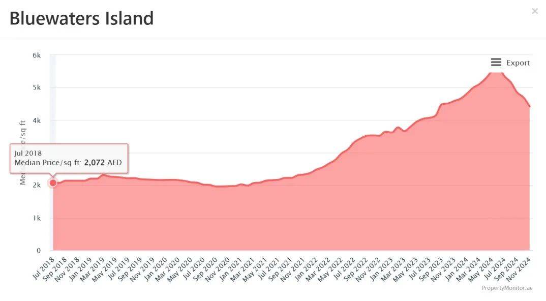 蓝水岛开盘均价为2,072AED/平方英尺,目前交易均价为4,419.58AED/平方英尺,涨幅达113.3%