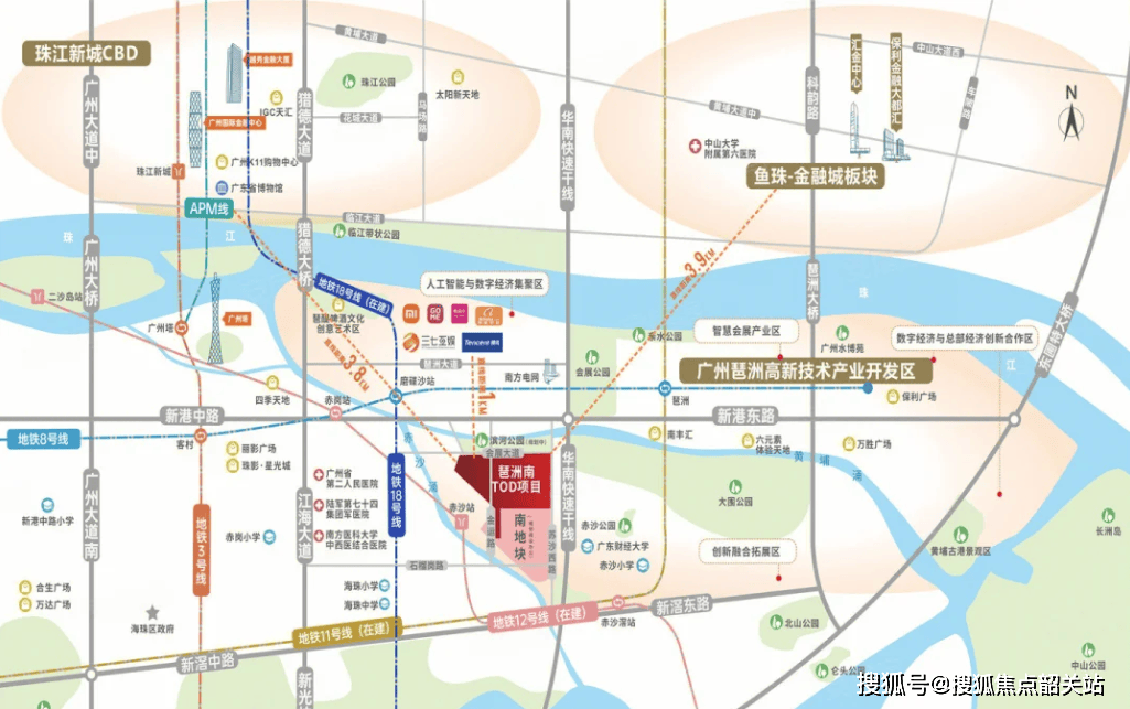 项目依托TOD开发模式的核心优势,构建起“地铁+快速路+轨道交通枢纽”三维立体交通网络,可快速通达广州全城及粤港澳大湾区核心城市。地铁出行方面,项目距离地铁8号线号线米,步行即可抵达,其中18号线分钟可直达白云国际机场;在建的地铁12号线赤沙站直接嵌入项目地块中部,未来可实现社区与地铁站点的无缝衔接,该线年底通车,通车后可串联白云、越秀、海珠、番禺四大核心区,便捷换乘广州地铁全线号线作为广州首条环线地铁,可快速通达琶洲、珠江新城、白鹅潭等核心商圈。自驾出行方面,项目2公里范围内可接入华南快速干线、新滘路、琶洲大道等城市主干道,通过华南快速可快速接驳广州环城高速、京港澳高速等高速路网,15分钟内可通达珠江新城、广州塔、金融城等城市核心地标,30分钟内可覆盖广州中心城区大部分区域。公共交通方面,项目1公里范围内布局有赫基大厦站、海港花园站、磨碟沙地铁站等多个公交站点,覆盖10余条公交线路,可满足日常短途出行需求,形成了多层次、全维度的交通出行体系。
